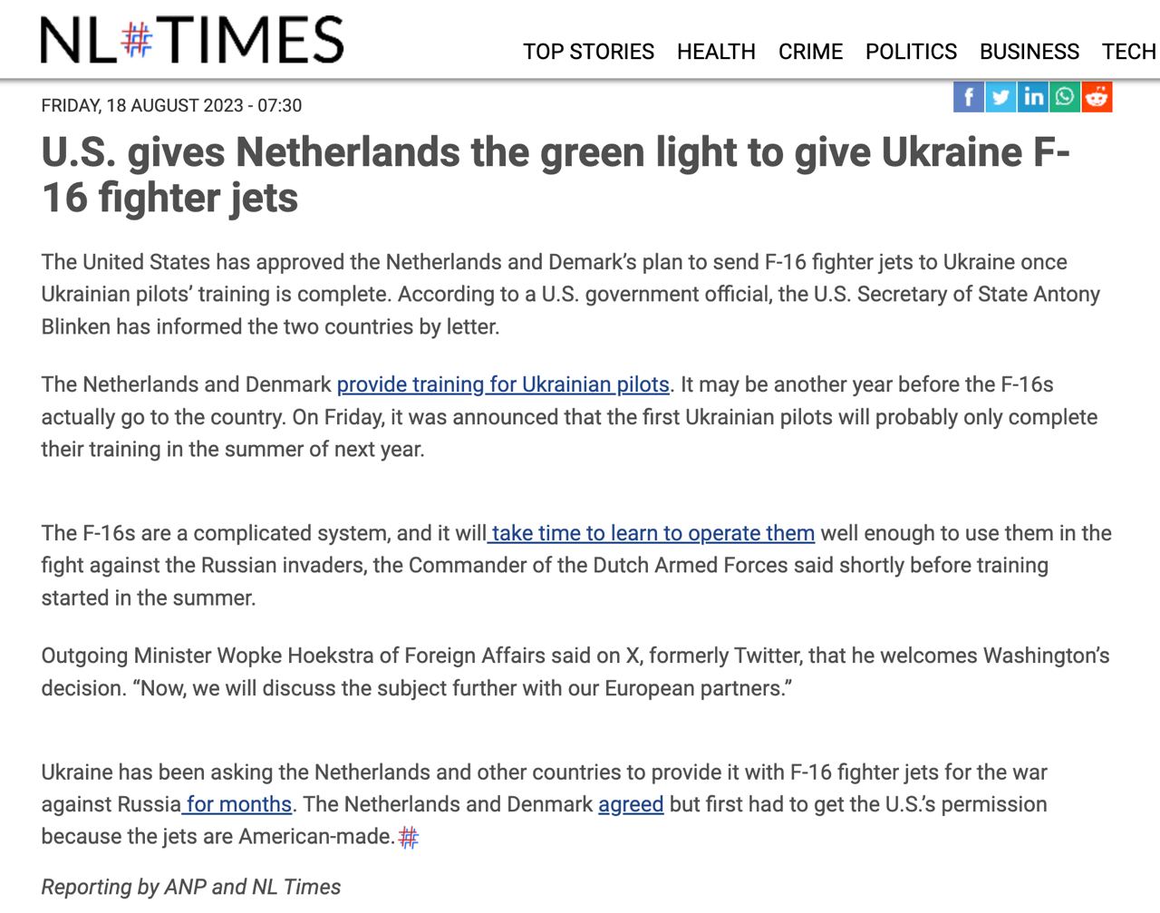 Перед цим США схвалили передачу Україні винищувачів F-16 із Данії та Нідерландів, зазначивши, що це станеться після завершення підготовки українських пілотів.