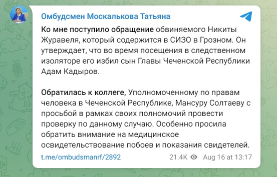 "До мене надійшло звернення обвинуваченого Микити Журавеля, який утримується у СІЗО у Грозному. Він стверджує, що під час відвідин у слідчому ізоляторі його побив син голови Чеченської Республіки Адам Кадиров", - розповіла Москалькова.