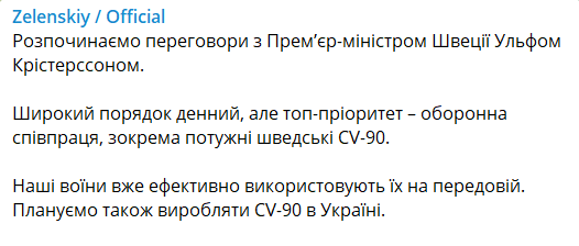 "Широкий порядок денний, але топ-пріоритет – оборонна співпраця, у тому числі потужні шведські CV-90 (БМП, на фото - Ред.). Наші воїни вже ефективно використовують їх на передовій. Плануємо також виробляти CV-90 в Україні", - Заявив Зеленський.