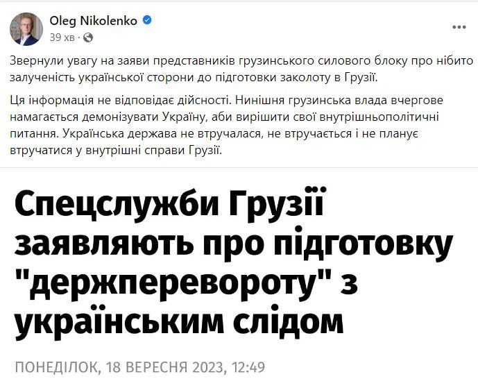 "Цьогорічна грузинська влада вкотре намагається демонізувати Україну, щоб вирішити свої внутрішньополітичні питання. Українська держава не втручалася, не втручається і не планує втручатися у внутрішні справи Грузії", - зазначив дипломат.