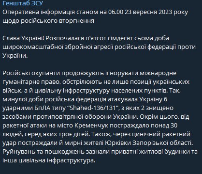 Окупанти продовжують ігнорувати міжнародне гуманітарне право. Минулої доби російська федерація атакувала Україну 6 ударними БпЛА типу Shahed-136/131, з яких 2 знищені засобами протиповітряної оборони України. Крім цього, від ракетної атаки на місто Кременчук постраждали понад 30 людей, серед яких троє дітей. Також через ракетний удар постраждали і мирні жителі Юрківки Запорізької області.
