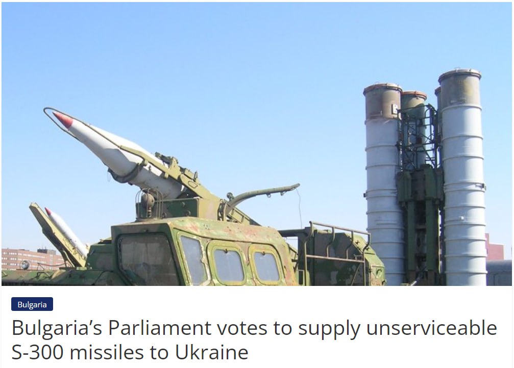 Парламент Болгарії проголосував за постачання непридатних для експлуатації ракет С-300 Україні. Дебати тривали понад три години, починаючи з відкритого засідання, а потім перейшовши за зачинені двері, щоб вислухати головнокомандувача адмірала Еміля Єфтімова та заступника командувача ВПС бригадного генерала Петьо Мірчева.