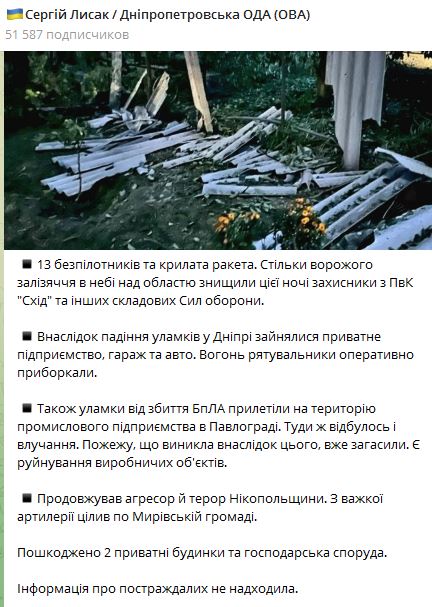 Також уламки від БПЛА впали на територію промислового підприємства у Павлограді. Туди ж трапилося і попадання. Пожежа, яка виникла внаслідок цього, вже була згашена. Є руйнація виробничих об'єктів.