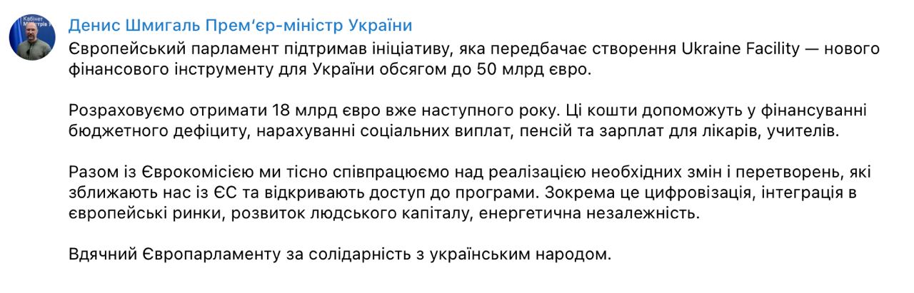 Європарламент підтримав створення Ukraine Facility – нового фінансового інструменту для України на 50 млрд євро, які можуть бути виділені до 2027 року в обмін на реформи.