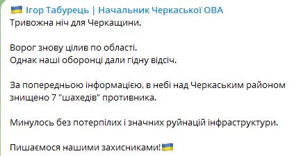 "За попередньою інформацією, у небі над Черкаським районом знищено сім "шахедів" противника. Обійшлося без постраждалих і значних руйнувань інфраструктури", - написав глава ОВА.