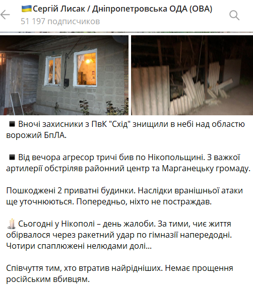 Глава ОВА додав, що сьогодні у Нікополі - день жалоби на згадку про загиблих після ракетного удару по гімназії.