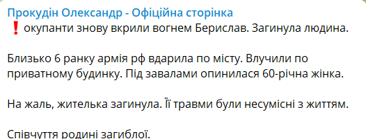 На жаль, мешканка загинула. Її травми були несумісні із життям", - написав Прокудін.