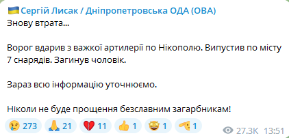 "Ворог вдарив із важкої артилерії по Нікополю. Випустив по місту 7 снарядів. Загинув чоловік", - написав він.