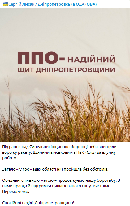 "Під ранку над Синельниківщиною захисники неба знищили ворожу ракету. Вдячний військовим із ПВК "Схід" за точну роботу. Загалом у громадах області ніч пройшла без обстрілів", - написав Лисак.