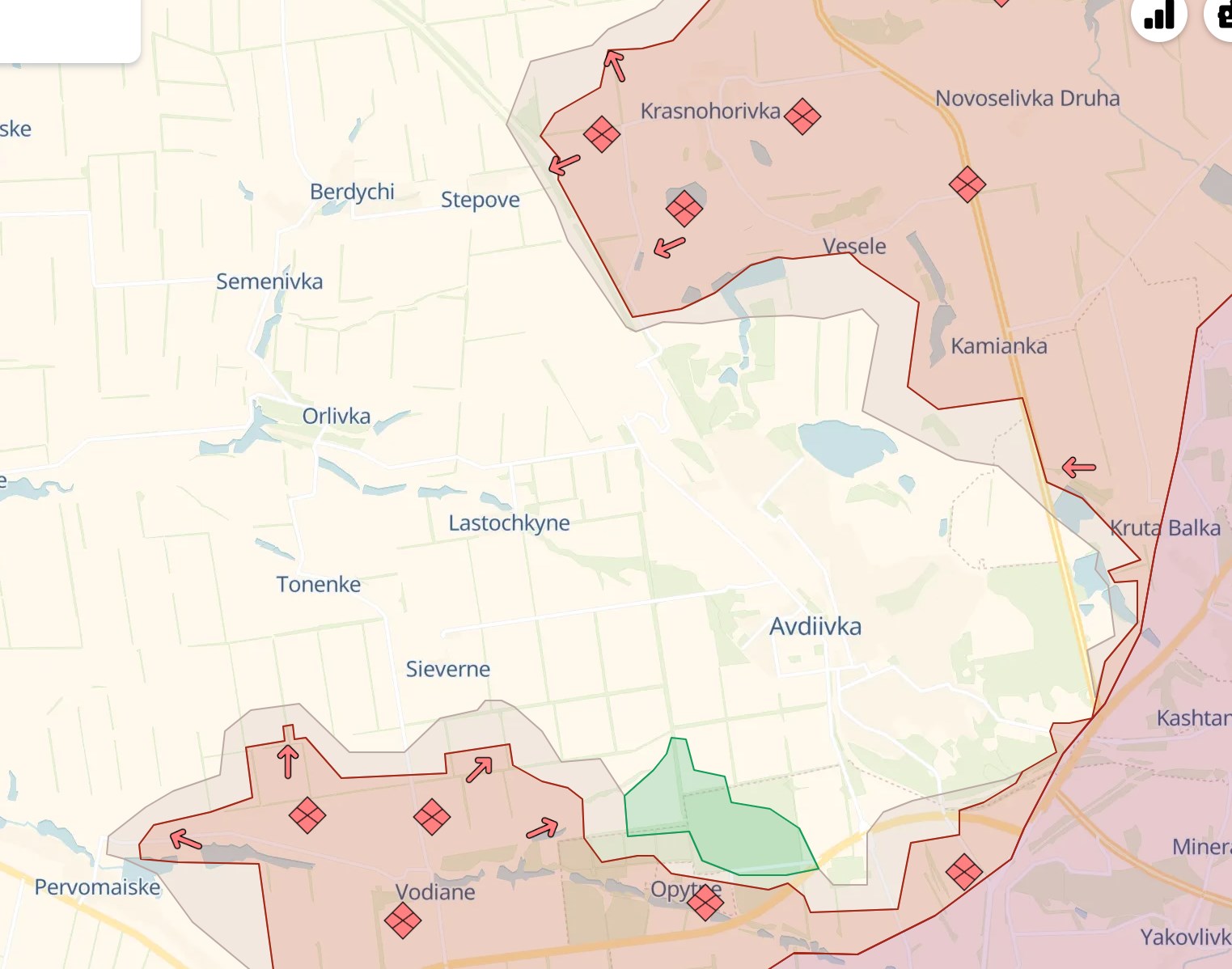 На південний захід від Авдіївки росіянам вдалося видавити ЗСУ з кар'єру біля Водяного, повідомляє телеграм-канал Deep State. З того ж боку РФ продовжує тиск у бік Північного та Тоненького, але там атаки відбиваються.