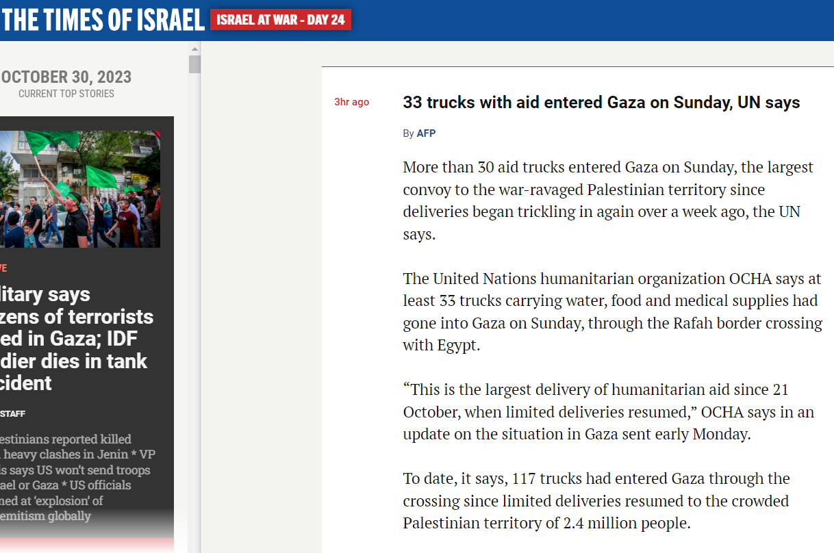 За даними ООН, через Рафах до Гази з моменту відновлення постачання 21 жовтня пройшли 117 фур. Цього вкрай мало, сектор Гази потребує продовольства, медикаментів та палива для лікарень у значно більших обсягах.