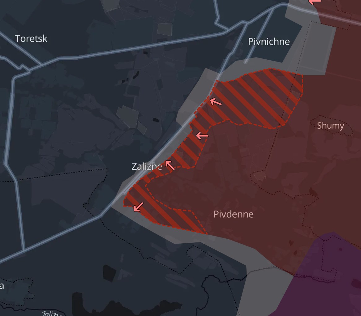 3. На Торецькому напрямку російські війська просунулися у населених пунктах Залізне та Північне. Наблизившись таким чином до Торецька зі сходу.