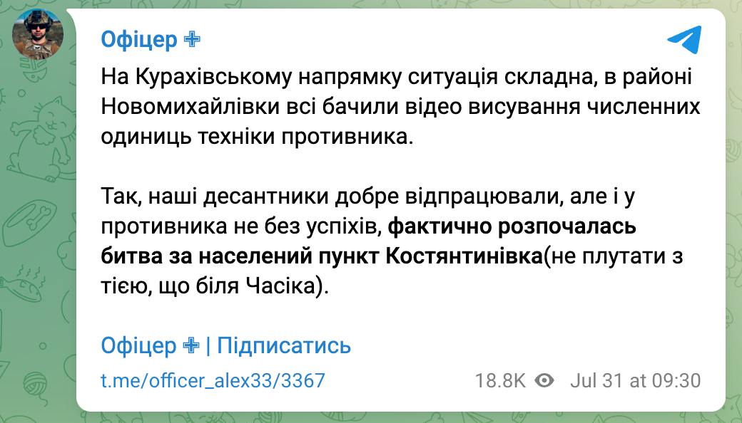 Однак військовий пише, що "наші десантники добре відпрацювали, але й у противника не без успіхів фактично розпочалася битва за Костянтинівку".