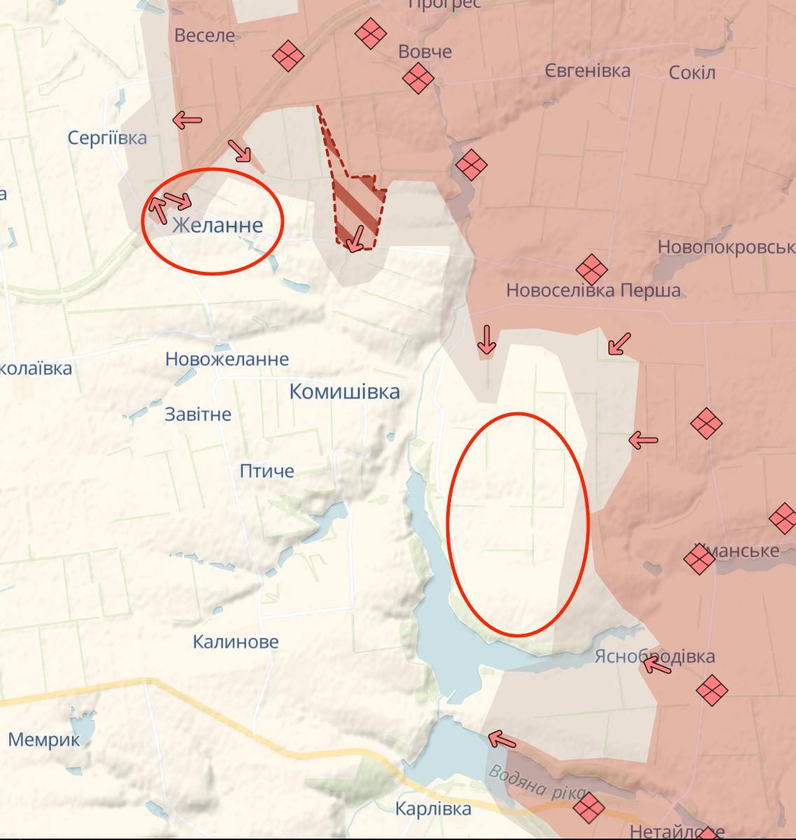 За даними паблика Deep State, на східних підступах до Торецька російські війська просунулися у Північному та Залізному. Військовий аналітик Bild Юліан Ріпке, посилаючись на геолоковані відео, пише, що Залізне захоплено на 90%.