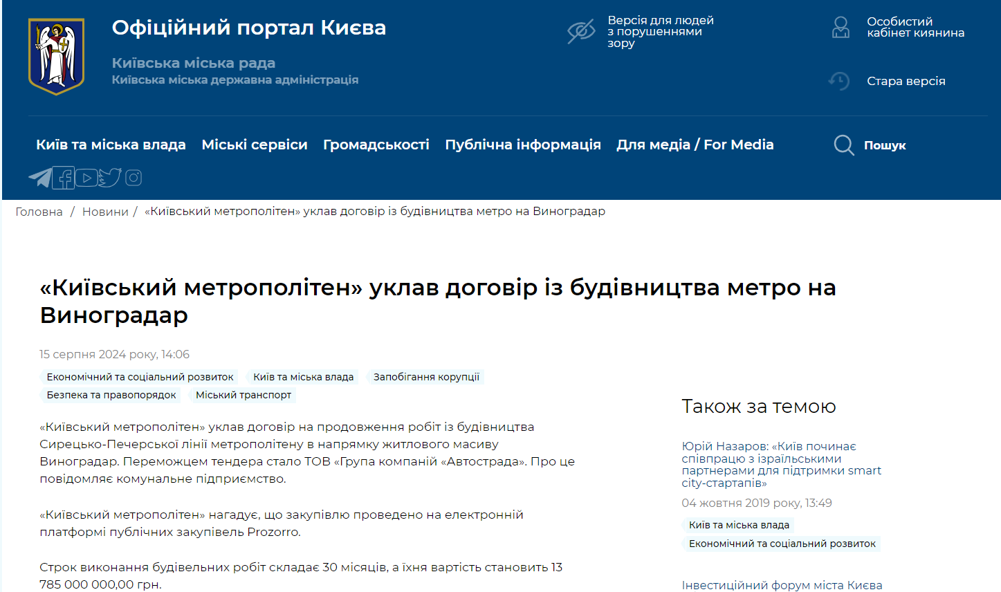 "Київський метрополітен" уклав договір із новим підрядником на будівництво Сирецько-Печерської лінії у напрямку Виноградаря за 13,8 млрд гривень.