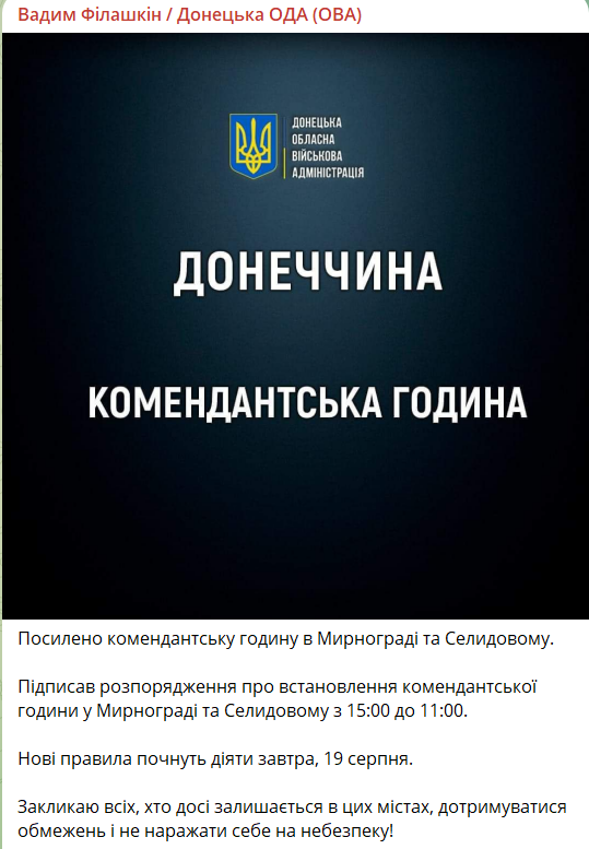 Як повідомив начальник Донецької ОВА Вадим Філашкін, з 19 серпня комендантська година у Мирнограді та Селідовому буде з 15:00 до 11:00.