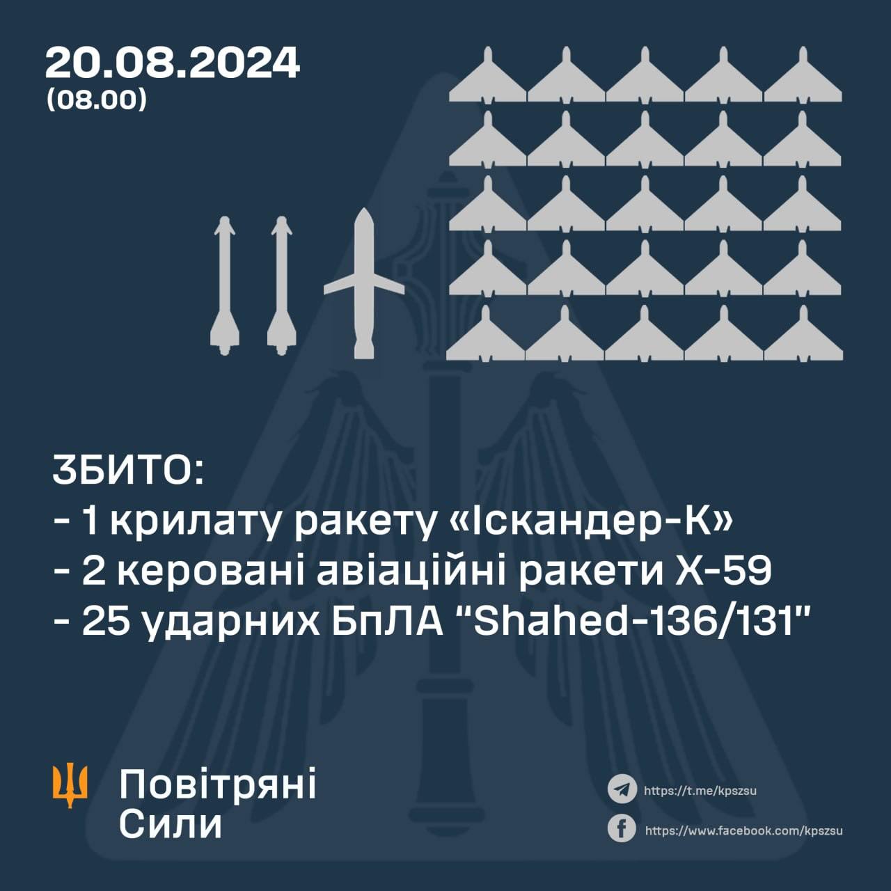 8.23 Вночі Україна збила 25 із 26 безпілотників "Шахед", один із трьох "Іскандерів" та дві авіаракети Х-59.