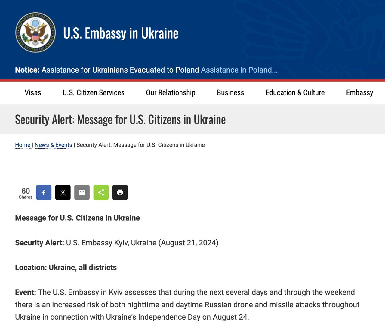 "Протягом наступних кількох днів та у вихідні існує підвищений ризик як нічних, так і денних російських безпілотних та ракетних атак по всій території України у зв'язку з Днем Незалежності України 24 серпня", - йдеться у повідомленні посольства США в Україні.