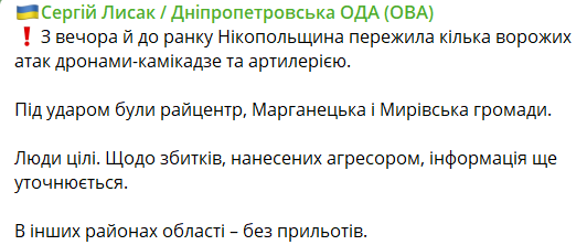 08:05 Вночі Нікопольський район росіяни обстрілювали дронами-камікадзе та артилерією. Про це повідомив голова Дніпропетровської ОВ Сергій Лисак.