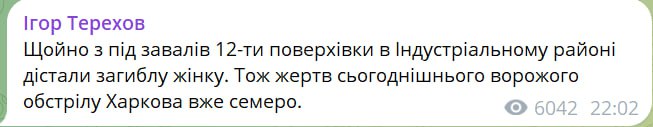 22.07 У Харкові сьомий загиблий внаслідок сьогоднішнього удару.