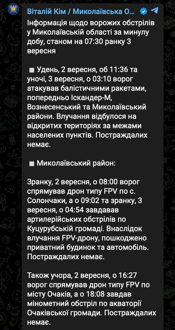 07:50 Влада Миколаївської області підтвердила, що вчора були два удари "Іскандерами" "по відкритій території" - під Вознесенськом та Миколаєвом.