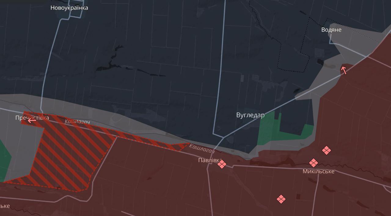 07:59 Російські війська просунулися біля Пречистівки на захід від Вугледару. А також розширили сіру зону в районі Водяного на північний схід.