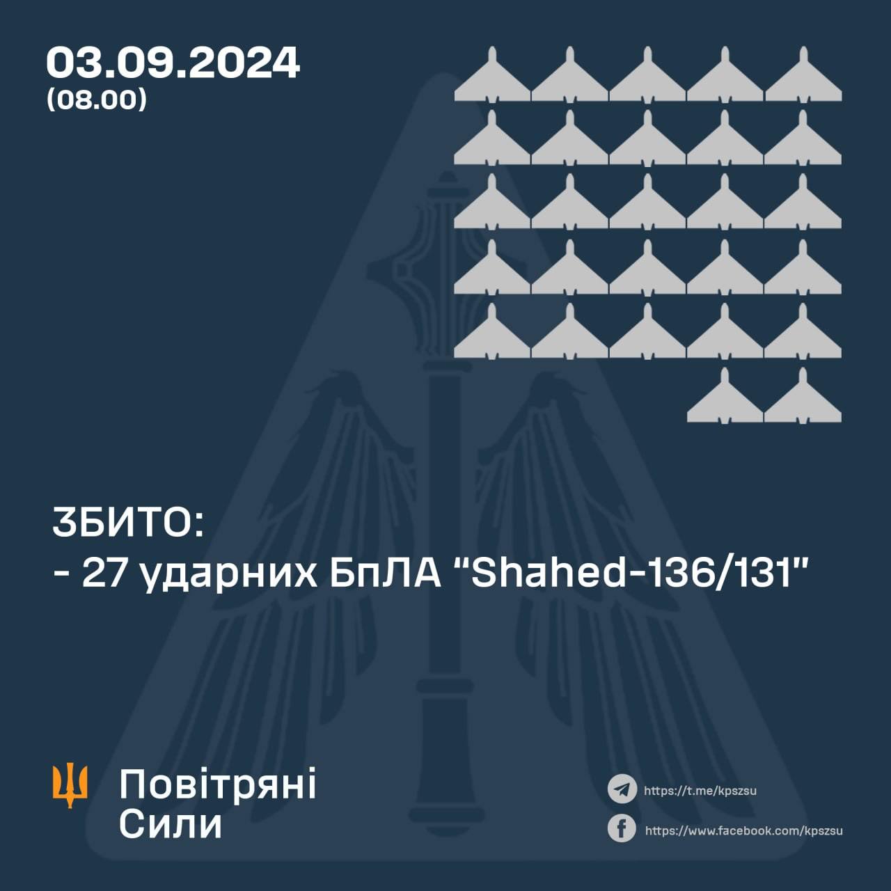 Збито 27 "Шахедів", повідомили Повітряні сили.