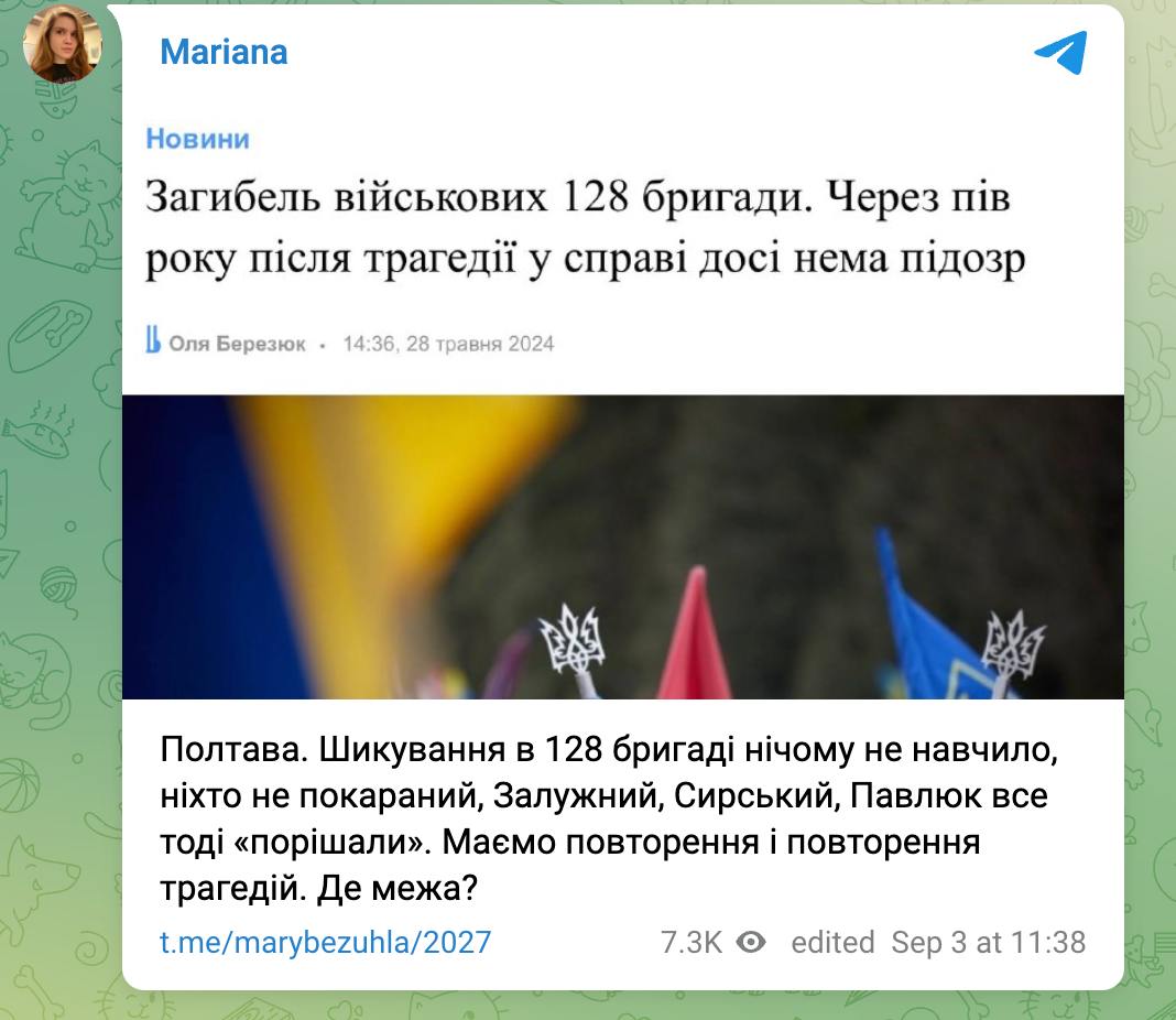"Полтава. Побудова у 128 бригаді нічого не навчила, ніхто не покараний, Залужний, Сирський, Павлюк усе тоді "вирішували". Є повторення та повторення трагедій. Де межа?" – пише нардеп.