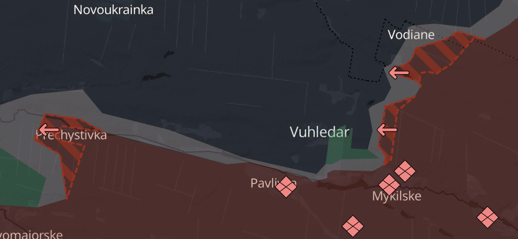 Російські війська захопили Пречистівку на захід від Вугледару і просунулися в районі Водяного на північний схід від Вугледару. Також вони наблизилися до Вугледар зі сходу, повідомляє український військовий паблік Deep State.