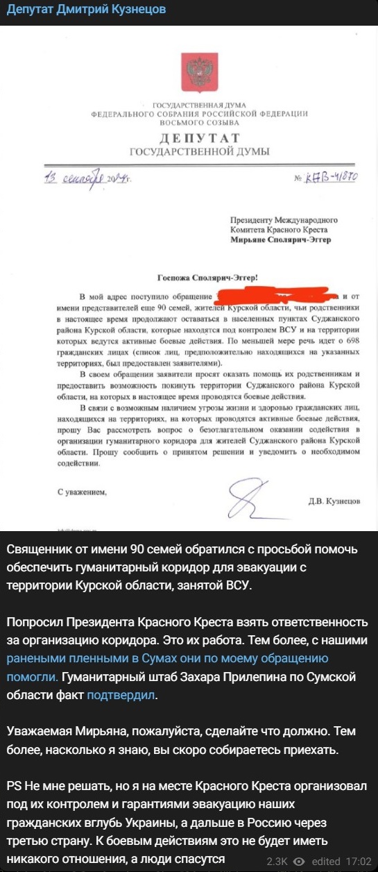 За словами Кузнєцова, до нього звернувся священик, який від імені 90 сімей Курської області попросив допомогти забезпечити гуманітарний коридор.