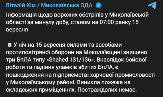 08:15 На Миколаївщині вночі було збито три БПЛА типу "Shahed 131/136". Про це повідомляє голова ОВВ Віталій Кім.