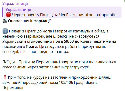 Поїзди з Праги до Чопа і назад їхатимуть в об'їзд із невеликою затримкою, але ці рейси не скасовуються. Український стикувальний поїзд 59/60 до Києва чекатиме на пасажирів із Праги. Це стосується рейсів із прибуттям як сьогодні, так і – попередньо – завтра.