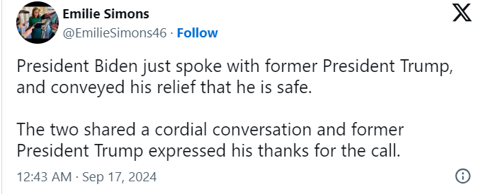 Перший заступник прес-секретаря Білого дому Емілі Саймонс опублікувала в соціальних мережах повідомлення про те, що президент "висловив полегшення від того, що він (Трамп – Ред.) у безпеці".