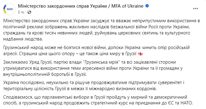 "Міністерство закордонних справ України засуджує і вважає неприпустимим використання у політичній рекламі зображень жахливих наслідків безжальної війни Росії проти України, страждань і крові тисяч невинних людей, руйнувань церковних святинь та культурного надбання людства. Грузинський народ може не боятися нової війни, доки Україна чинить опір російській агресії. Страшна ціна цього опору – це також ціна миру в Грузії. у Фейсбуці.