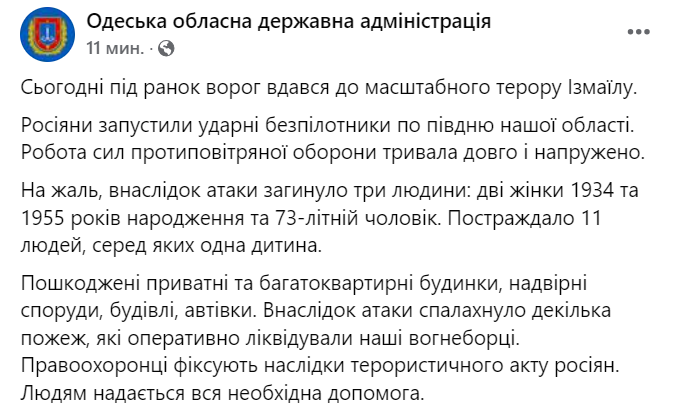 Сьогодні росіяни атакували ударними безпілотниками Ізмаїл на Одещині. Загинули троє людей, постраждали 11.