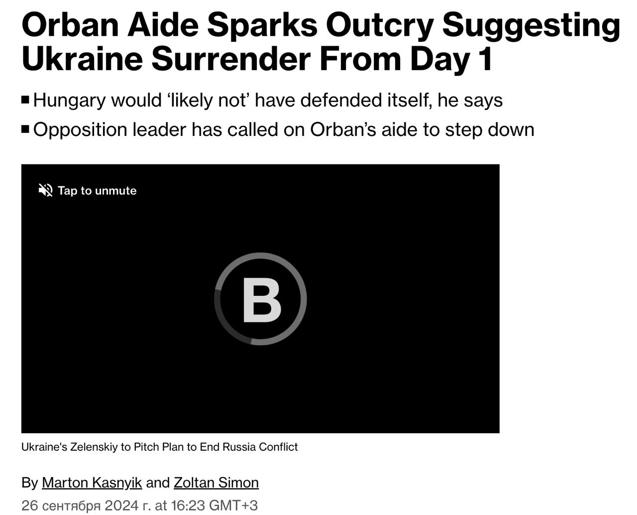 У підкасті тижневика Mandiner радник прем'єра, його однофамілець Балаш Орбан заявив, що Угорщина порадила б президенту Володимиру Зеленському не чинити збройний опір у 2022 році, щоб мінімізувати втрати серед мирного населення.