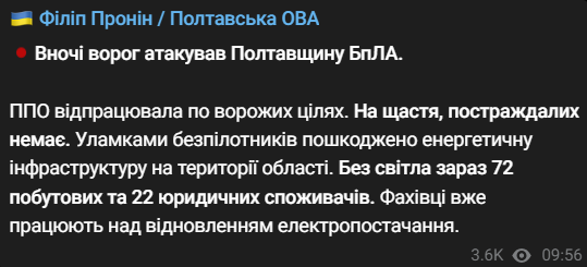 У Полтавській області уламками "Шахедів" пошкоджено енергетичну інфраструктуру на території області, повідомляє голова Полтавської ОВА Філіп Пронін.