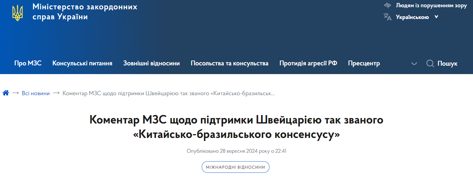 Представник МЗС Швейцарії Ніколя Бідо заявив, що китайсько-бразильська ініціатива закликає до припинення вогню і "спрямована на пошук політичного вирішення конфлікту".