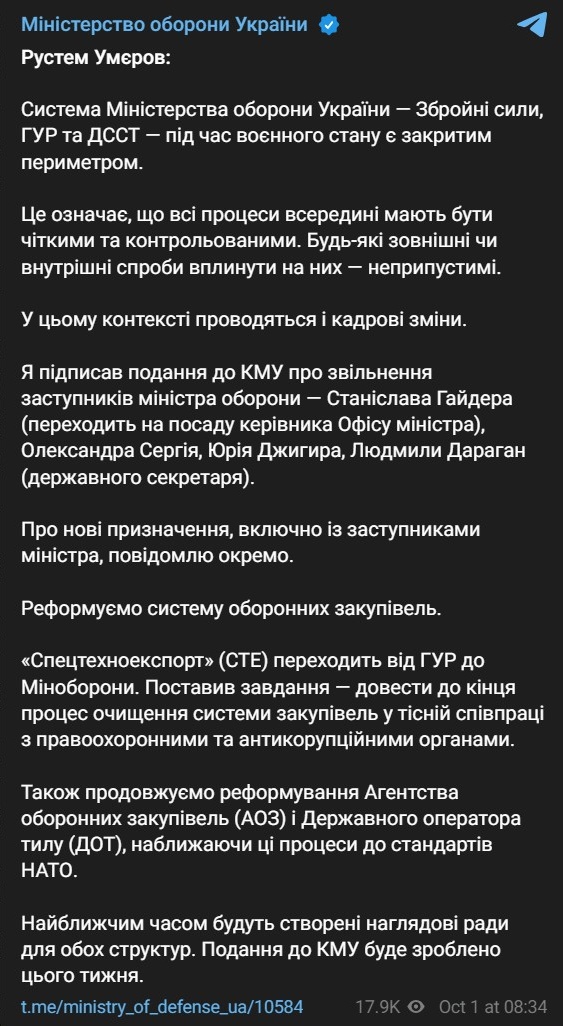 "Я підписав подання до КМУ про звільнення заступників міністра оборони – Станіслава Гайдера (переходить на посаду керівника Офісу міністра), Олександра Сергія, Юрія Джигіра, Людмили Дараган (державного секретаря).