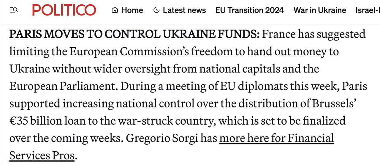 "Франція запропонувала обмежити свободу Європейської комісії у видачі грошей Україні без ширшого нагляду з боку національних столиць та Європейського парламенту. Під час зустрічі дипломатів ЄС цього тижня Париж підтримав посилення національного контролю за розподілом кредиту Брюсселя у розмірі 35 мільярдів євро для країни, охопленої війною, який має бути завершений найближчими тижнями", - сказано у публікації видання.