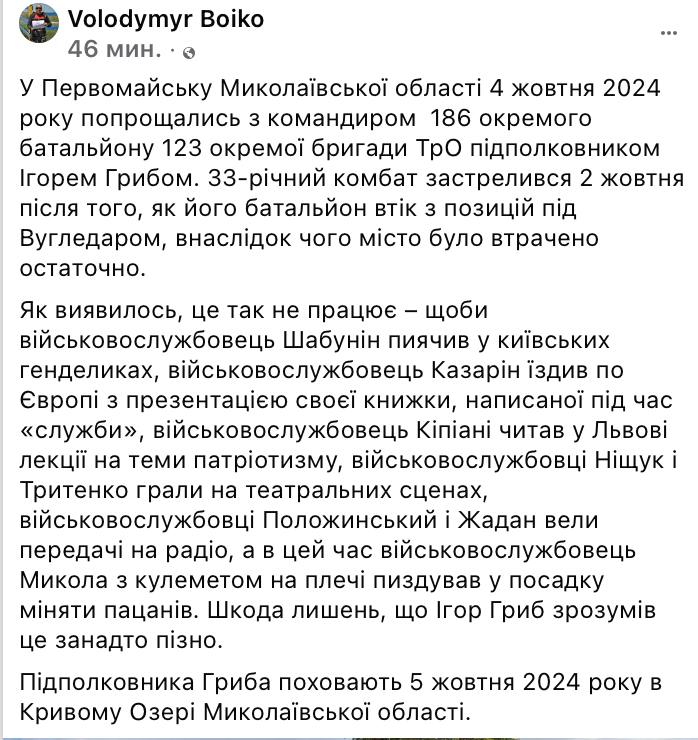 Підтверджується самогубство комбата 86-го батальйону 123-ї бригади ТрО Ігоря Гриба, про що сьогодні писала воїнкор Юлія Кирієнко-Мерінова.