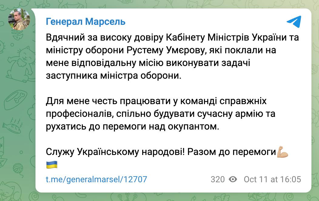 Він дякує Умерову і Кабміну за довіру, пише про плани "спільно будувати сучасну армію і рухатися до перемоги".