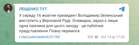 "У середу, 16 жовтня, президент Володимир Зеленський виступить у Верховній Раді. Очевидно, зараз лише одна причина для цього заходу: це публічне подання "плану перемоги", - написав Лещенко у своєму телеграм-каналі.