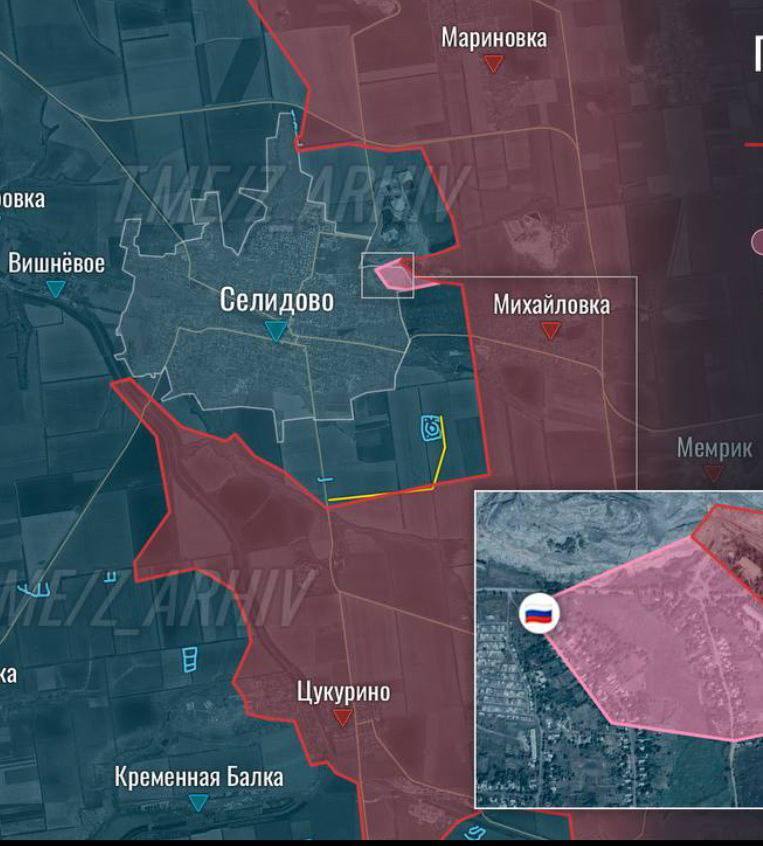 Також "Мучний" підтверджує дані російських пабліків, що вже йдуть штурми Вишневого на захід від Селідового, щоб відрізати місто від Покровська. Карта Deep State поки що дає картину станом на вчора і не відображає цих даних. При цьому захоплення Вишневого допоможе РФ встановити щільніший вогневий контроль над дорогою в Покровськ - єдиною вільною трасою з Селидово.