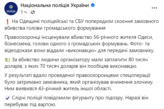 Національна поліція повідомляє, що спільно із СБУ зірвала замах на "главу громадського формування" Одеси.