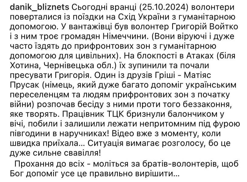 "У вантажівці був волонтер Григорій Войтко і з ним троє громадян Німеччини. Вони віруючі і дуже часто їздять до прифронтових зон з гуманітарною допомогою для цивільних. На блокпосту в Атаках (біля Хотина, Чернівецька обл.) їх зупинили і почали пресувати Григорія. Один з друзів Гриші, Матіяс Прусак (німець, який дуже багато допоміг українським переселенцям і людям прифронтових зон з початку війни), почав бесіду з ними проти беззаконня, що творять ТЦК. Працівники ТЦК бризнули балончиком в очі, побили і залишили лежати без свідомості під фурою півгодини! " - сказано у публікації.