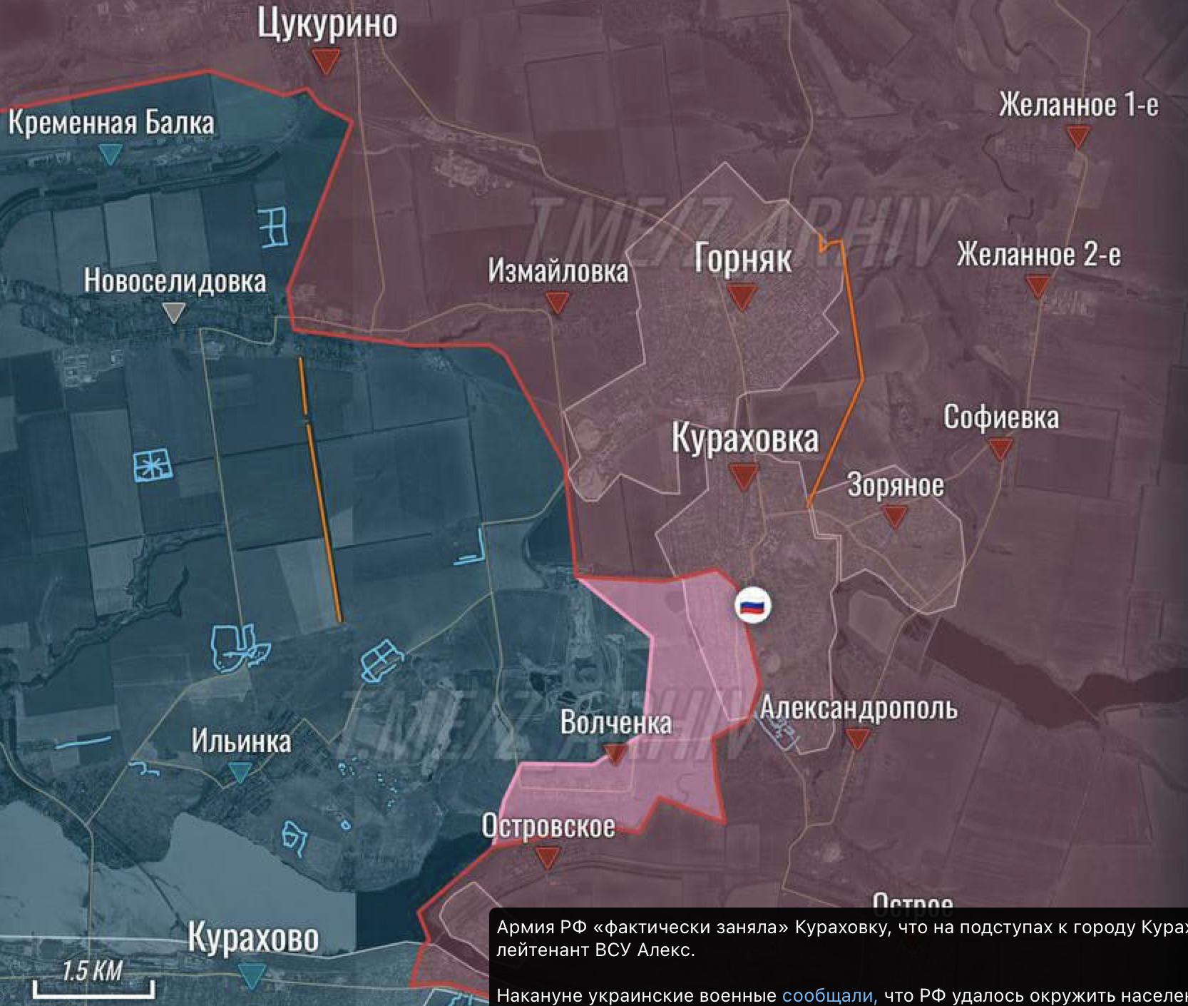 Росіяни ж у своїх картах стверджують, що захопили вже повністю і Курахівку, і сусідні Вовченку та Олександрополь. Що означає зрізання всієї "кишені" на північний схід від Курахового.