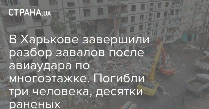 У Харкові завершили розбір завалів у багатоповерховому житловому будинку, до якого напередодні потрапила авіабомба. Підсумкова цифра – троє загиблих, у тому числі двоє дітей. Постраждали 36 людей.
