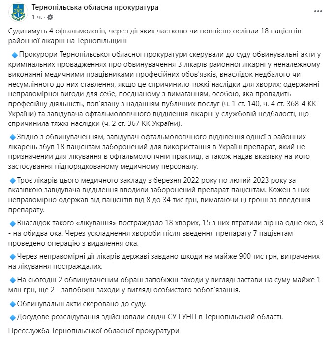 Троє лікарів лікарні з березня 2022 року по лютий 2023 року за вказівкою завідувача вводили препарат пацієнтам. За це кожен із окулістів отримав від пацієнтів від 8 до 34 тисяч гривень. Внаслідок такого "лікування" постраждали 18 хворих. 15 з них втратили зір на одне око, три – на обидва ока. Через ускладнення хвороби після введення препарату сім пацієнтів довелося видаляти очі.