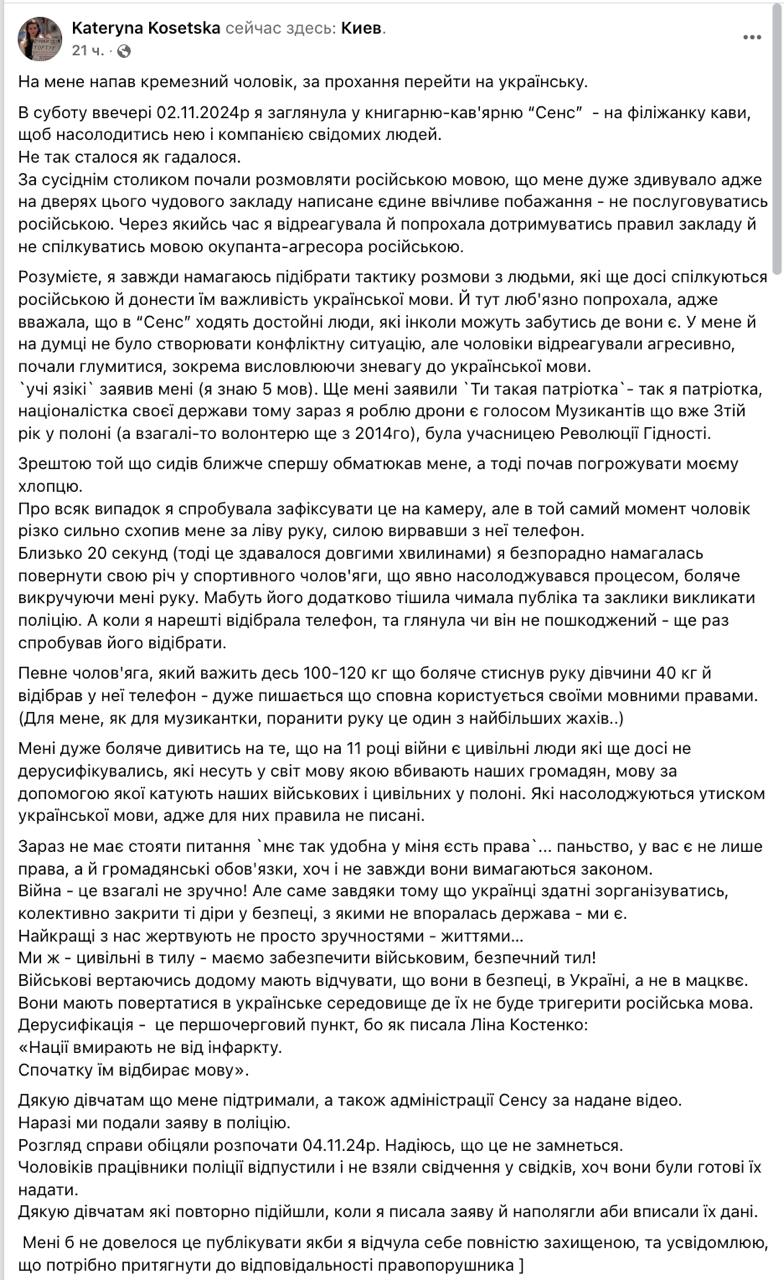 "Але чоловіки відреагували агресивно, почали знущатися, зокрема висловлюючи зневагу до української мови. Той, хто сидів ближче, спочатку обматюкав мене, а потім почав погрожувати моєму хлопцеві. Про всяк випадок я спробувала зафіксувати це на камеру, але в той же момент чоловік різко схопив мене за ліву руку, силоміць вирвавши телефон", - написала Косецька.